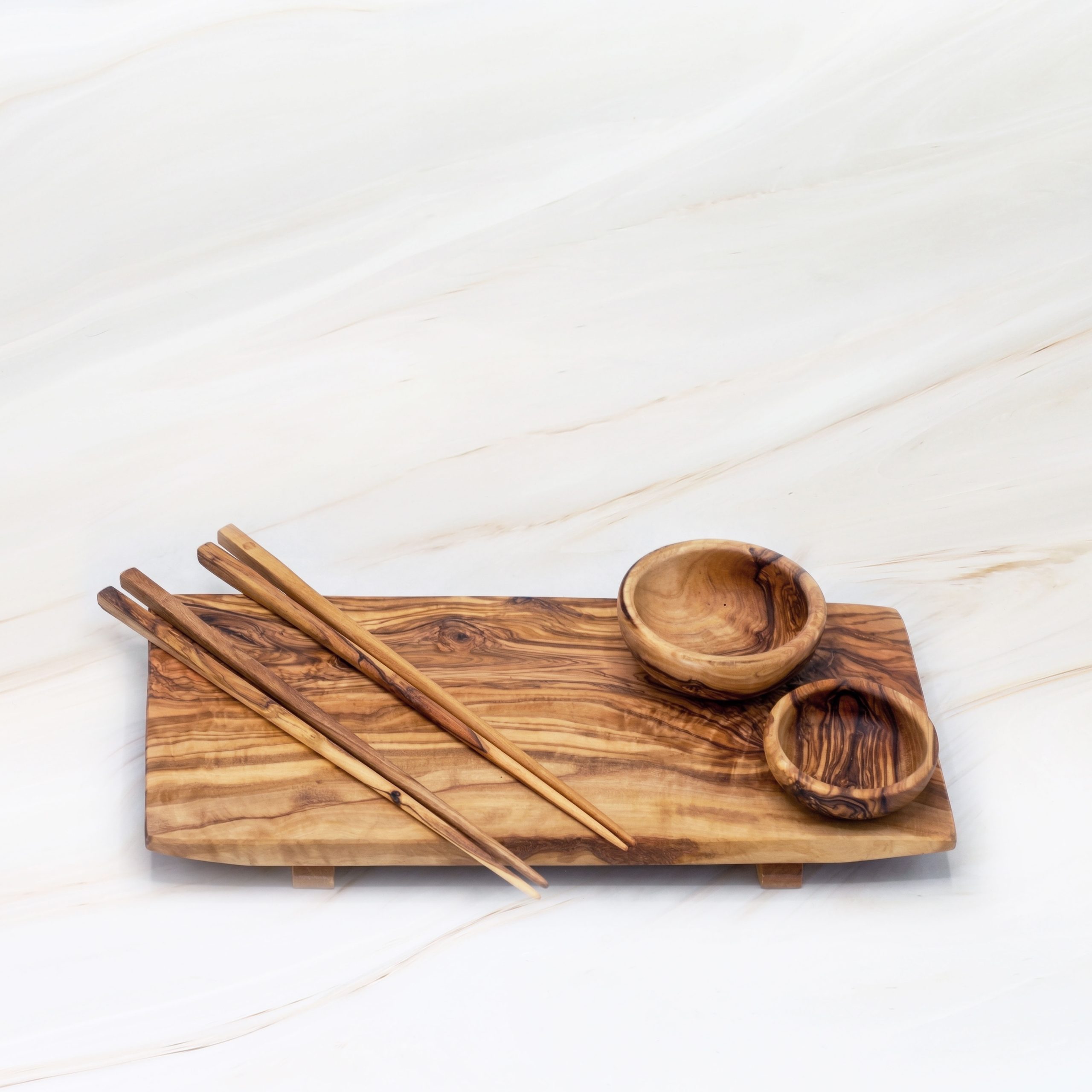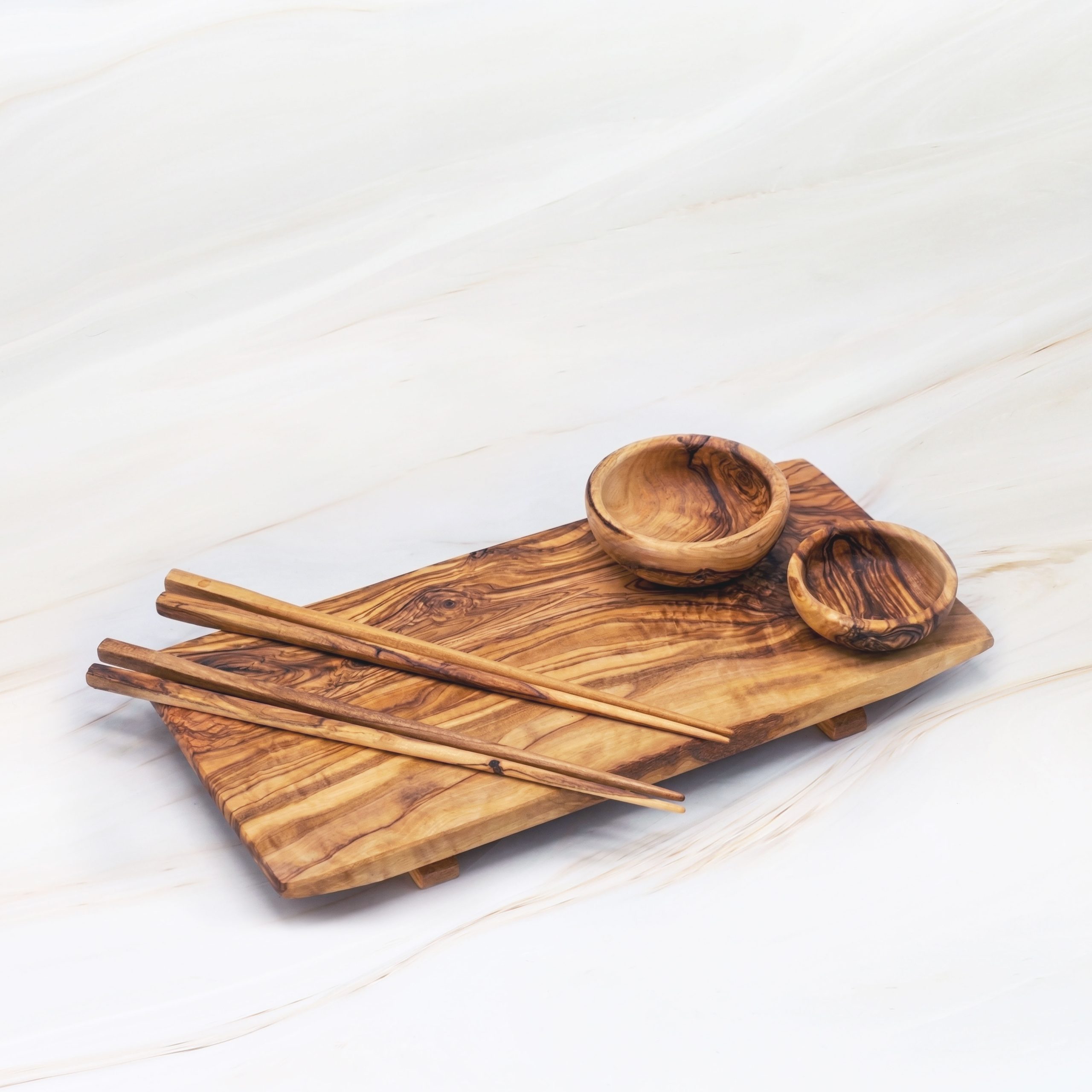 Olive Wood Sushi Serving Set – Serving Board with Chopsticks & Bowls